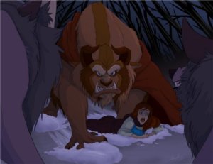 The Beast, in contrast, starts as a snarling dangerous monster, who takes Belle and her father prisoner and slowly progresses into a gentle, kindhearted person.